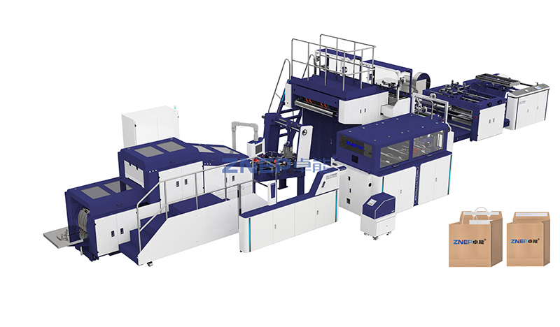 该机器用于生产带手挽加舌口的手提纸袋,由手挽工位将制好的圆绳和卷筒纸片自动做成手挽,通过输送系统将做好的手挽传送给切把、送把、贴把、压把的工位,然后将原色或印刷好的卷筒纸进行舌口的开窗吸废、涂胶贴纸、易撕线预刺、舌口位预刺、贴片避绳位点断、贴片位涂胶、自动粘贴手挽,再由主机将贴有手挽的纸张进行涂边胶、成筒、拉断、切断、压痕、底部涂胶、袋底成形并输送出袋,整个过程一次性同步完成。真正实现了全自动化生产,能够有效地节省人工成本。