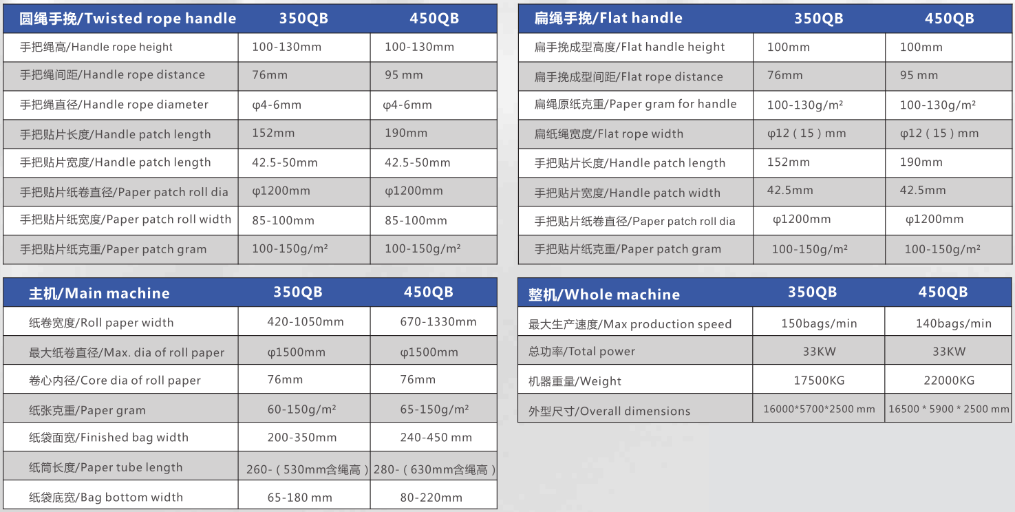 该机器用于生产带手挽的手提纸袋,由手挽工位将制好的圆绳和卷筒纸片自动做成手挽,通过输送系统将做好的手挽传送给切把、送把、贴把、压把的工位,然后将原色或印刷好的 卷筒纸进行贴片位点断、贴片位涂胶、自动粘贴手挽,再由主机将贴有手挽的纸张进行涂边胶、成筒、切断、压痕、底部涂胶、袋底成形并输送出袋,整个过程一次性同步完成。真正实现 了全自动化生产,能够有效地节省人工成本。