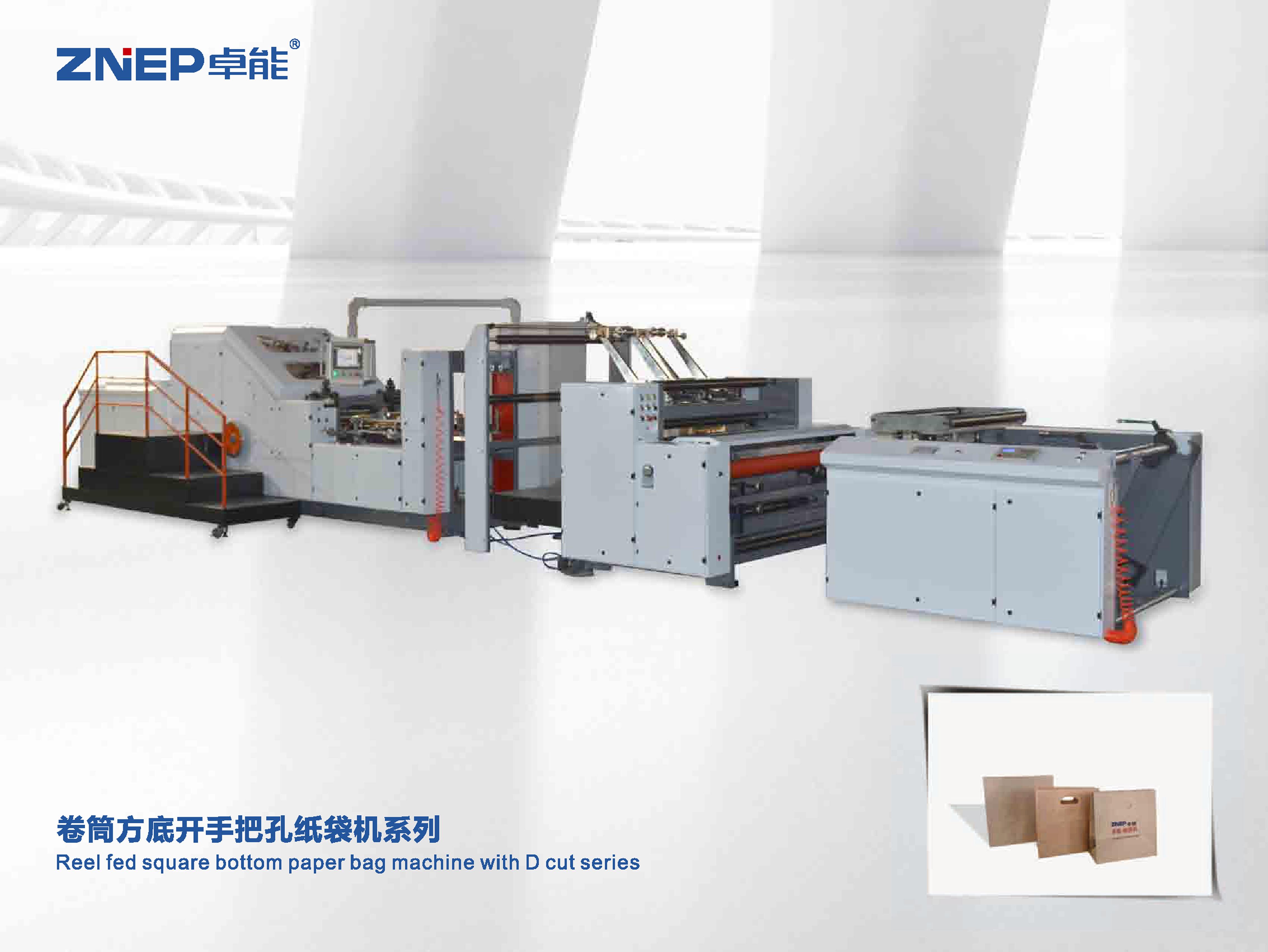 该机器用于生产带手把孔的手提纸袋。从卷筒进纸、上边胶、贴片(用于加固成品袋子的手把孔部位)、成筒、打手把孔、纸 筒打断、折底到出成品袋,整个过程一次性同步完成,并可选配同步连线印刷。成品纸袋使用功能性强,可广泛应用于商场购物、食品包装等。整机配有7套曰本原装进口的三菱伺服电控系统,精确度高,稳定性强,维护简便,生产高效,是各大印刷厂及生产纸 袋厂家理想的选购设备。